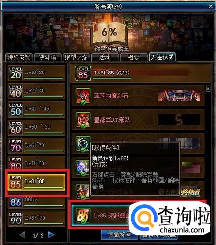 在左侧的分组中,点击进入“LV81~85”的分组,在此分组的最底部,可以看到“超越巅峰”的称号,该称号在角色达到LV85时自动获取,右键点击即可穿戴使用。