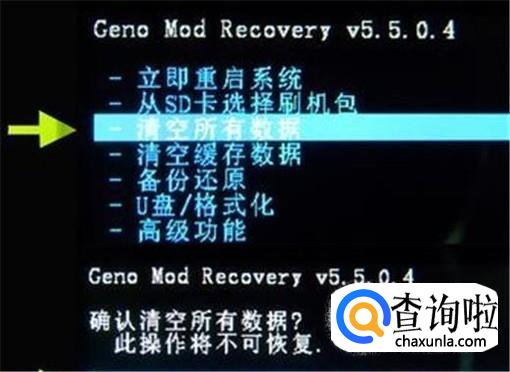 然后我们使用音量键上下移动光标,选择“清除所有数据”和“清除所有缓存”,最后保存设置,重启手机即可。