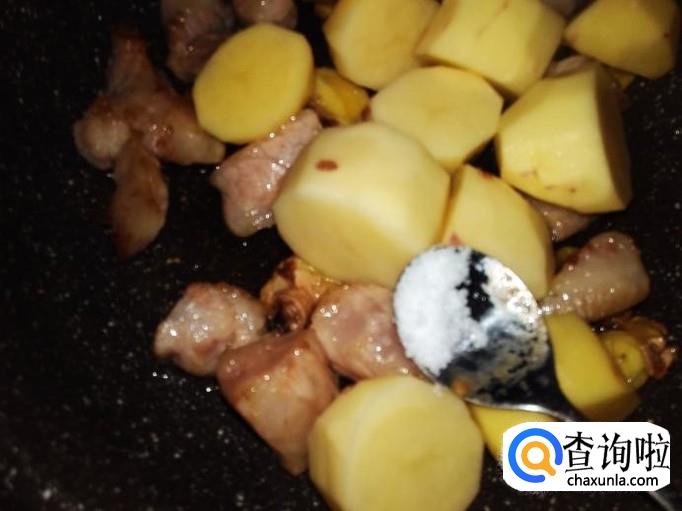 然后放土豆进去,加适量的盐翻炒20秒左右。