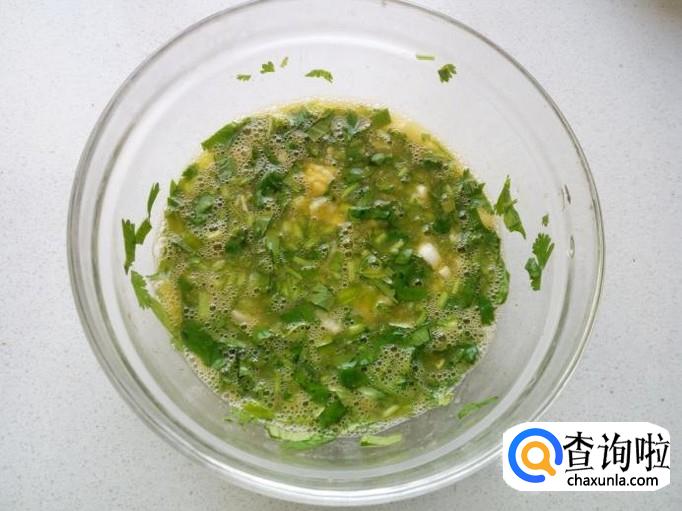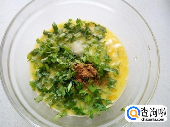 把切好的香菜末,青尖椒末,葱,姜末,一起放入到鸡蛋液中。放入五香粉,盐,味精,拌和均匀。