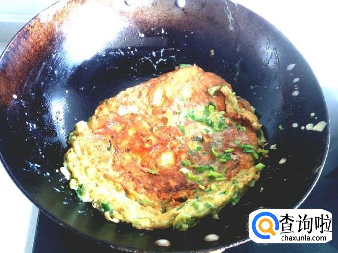 煎塌时要把鸡蛋液均匀开,否则会生疏不均。煎塌至香菜鸡蛋液凝固成饼状后,晃动锅,使鸡蛋饼与锅底脱离,然后颠勺翻面,煎塌另一面。