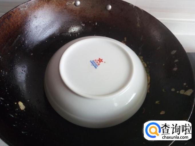煎塌至香菜鸡蛋液完全凝固,没有生鸡蛋液后,关火。把盛鸡蛋饼的盘子扣在鸡蛋饼上,盘底朝上。然后一手按住盘底,一手持锅翻个,把鸡蛋饼倒入盘中,即可。