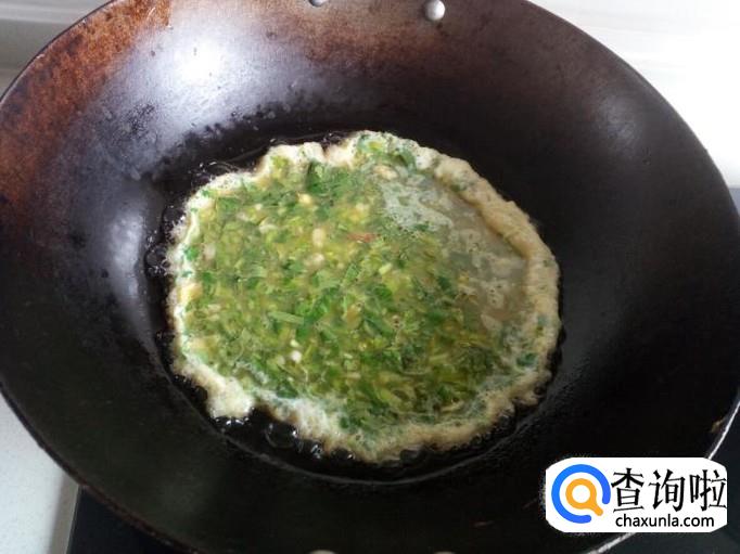锅内放入油加热(油不要太少,否则容易粘锅),油热后放入香菜鸡蛋液,小火煎塌。