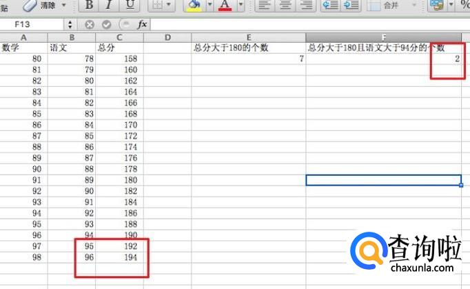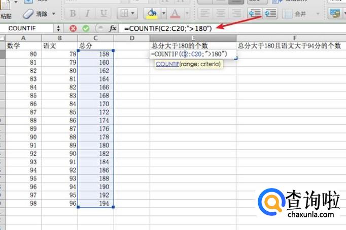 在f2单元格输入:=COUNTIFS(C2:C20;">180";B2:B20;">94")