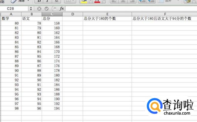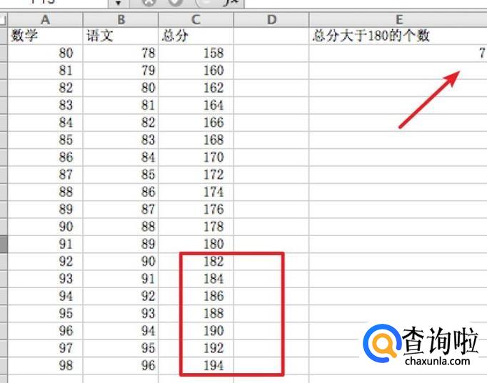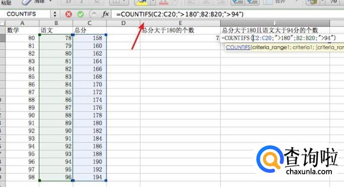 要统计总分大于180且语文大于94的人数,我们就可以使用COUNTIFS函数,