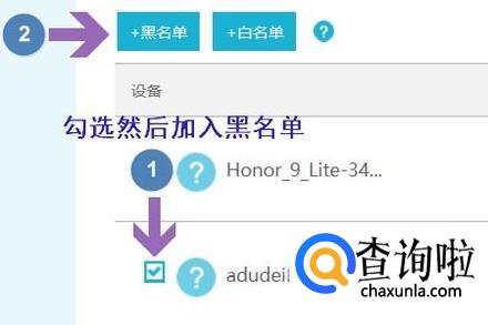 如果左侧的设备列表中我们发现了有不明设备处于连接状态,那就说明我们的无线网被别人蹭网了,首先采取的方法就是选中该设备然后将其加入黑名单,接着去修改WiFi密码即可;