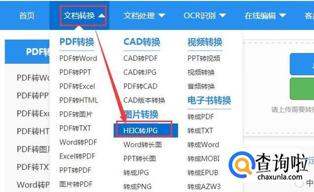 在页面中选择“文档转换”—“HEIC转JPG”选项,然后进入界面进行操作。