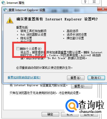 在重置设置里面,勾选删除个人设置,然后点击重置。
