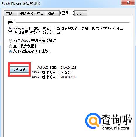 在弹出的对话框中,选择“更新”,在更新里面点开“立即检查”,就可以检查更新falsh player,更新完成后再试试打开网页图片是否会加载出来。