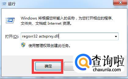 在运行里面输入“regsvr32 actxprxy.dll”,点击确定。