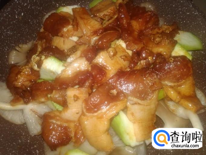 铺丝瓜最后铺上肉片。【不用加水因为丝瓜和秀珍菇都是含水份很多的食物】