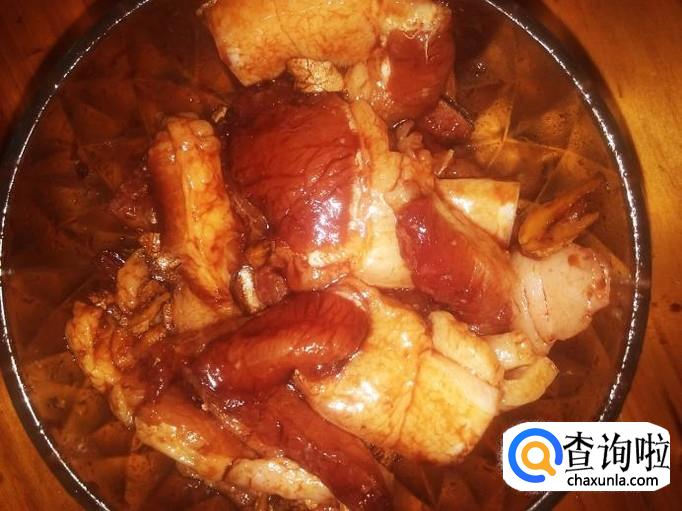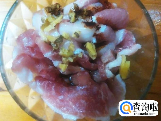 猪肉切成片,加适量的盐、姜蓉、生抽、料酒、老抽腌制几分钟。【盐和配料都下多点,因为煲的过程不用下料了】