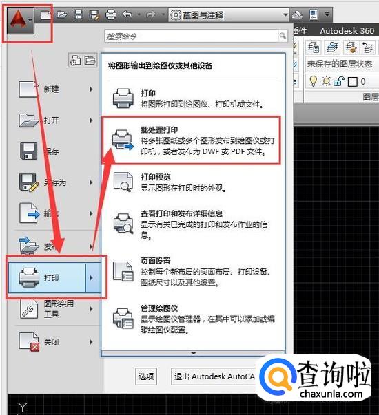 打开空白CAD,点击左上角下拉选项,选择“打印”,选择“批量打印”。