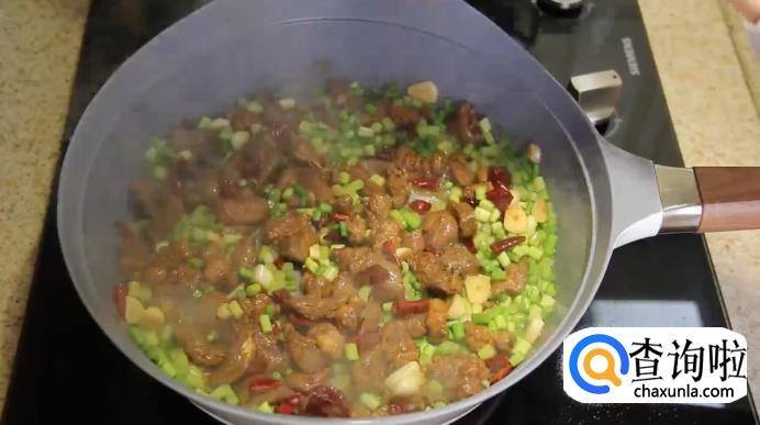 热锅起油,放入大蒜和干辣椒一起翻炒,炒香后放入牛肉继续翻炒,等牛肉炒变色之后,放入蒜苔翻炒。