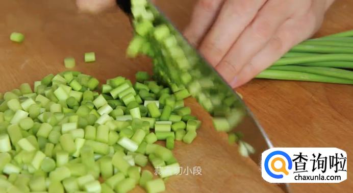 接着,将蒜苔切成小段,再把干辣椒也切成小段,可以不要里面的籽。大蒜切片,放在一旁待用。