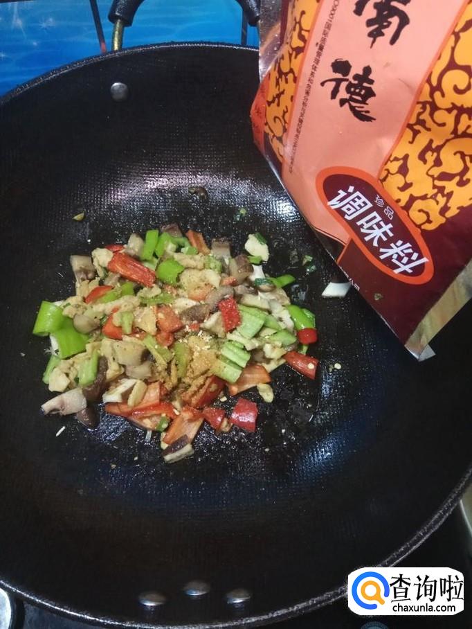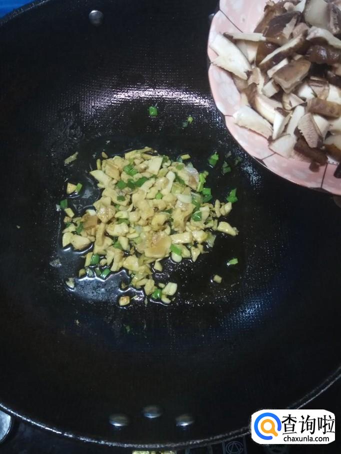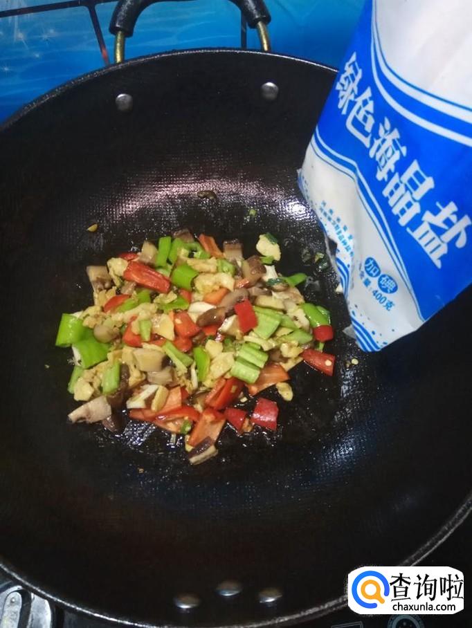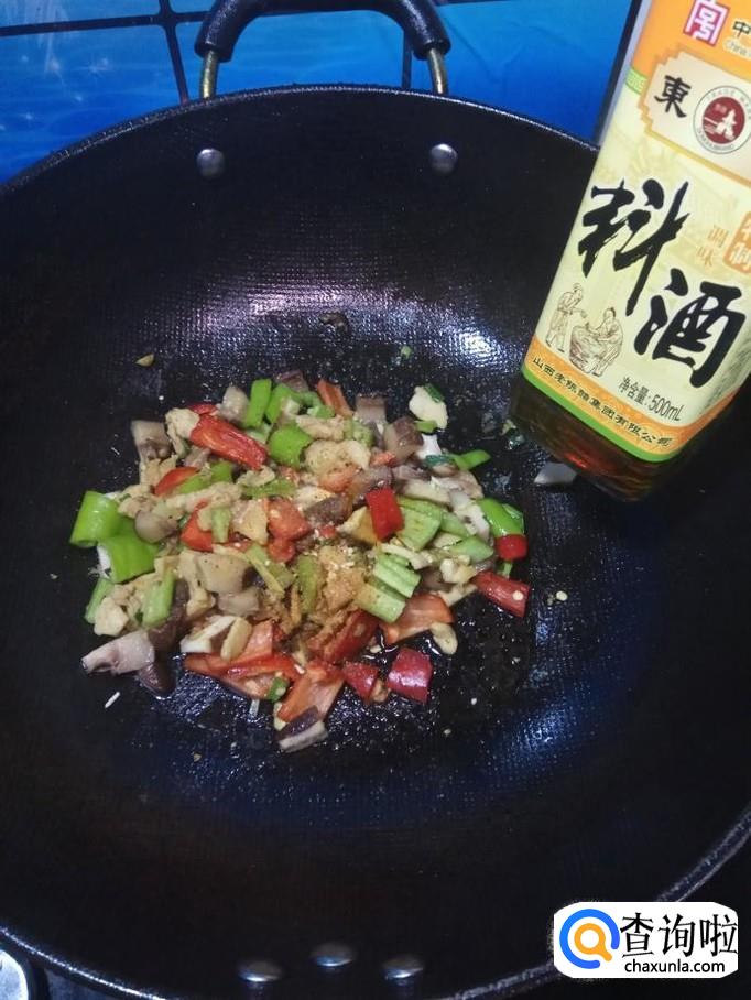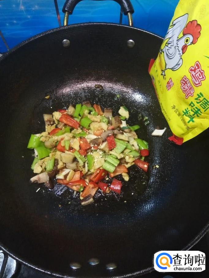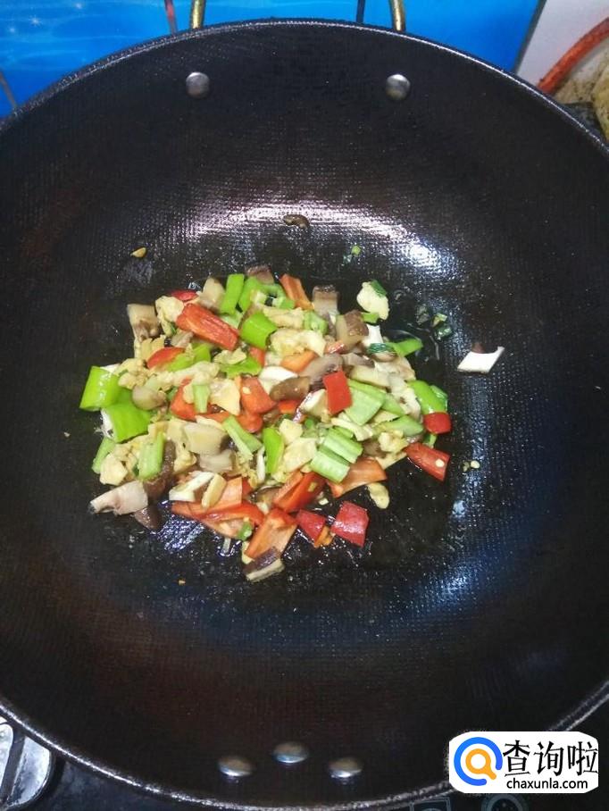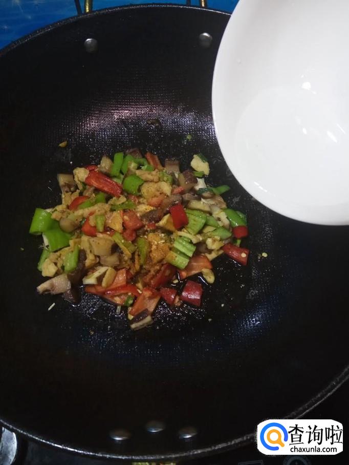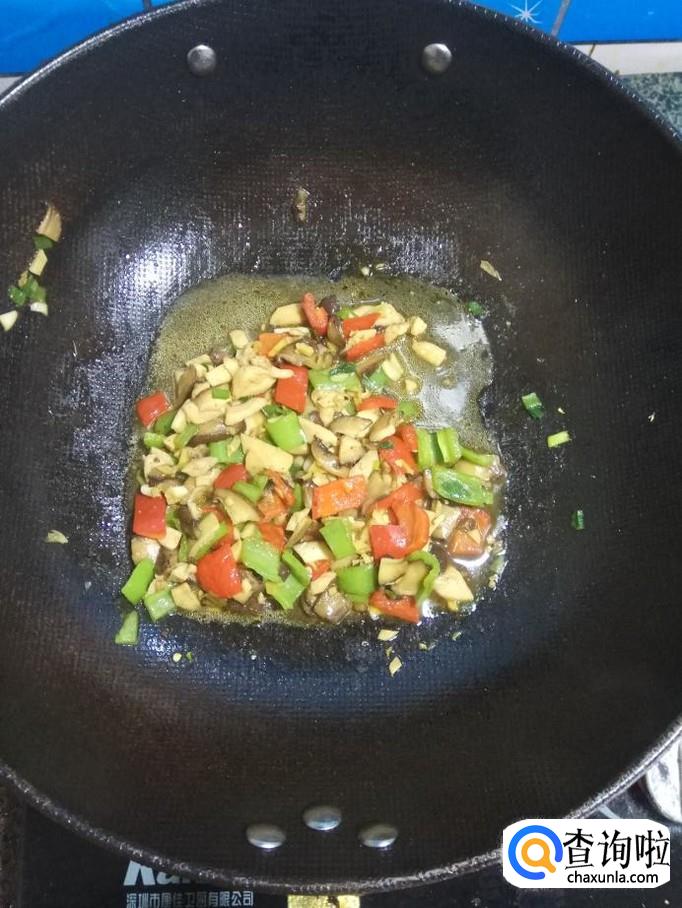 将香菇丁倒入锅中,翻炒均匀,然后将青红椒块,也倒入锅中,翻炒均匀。