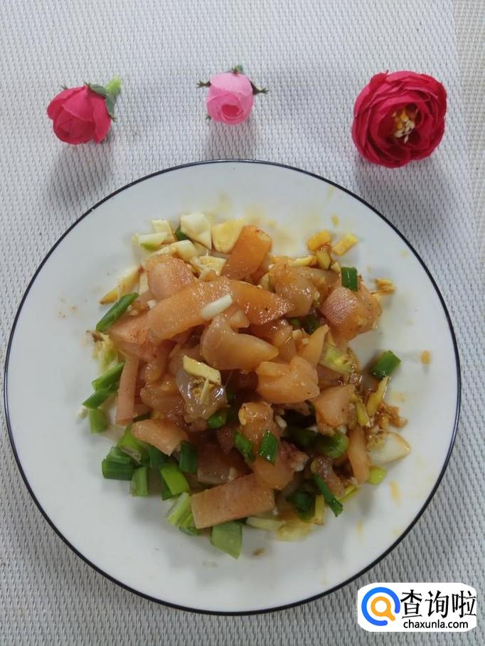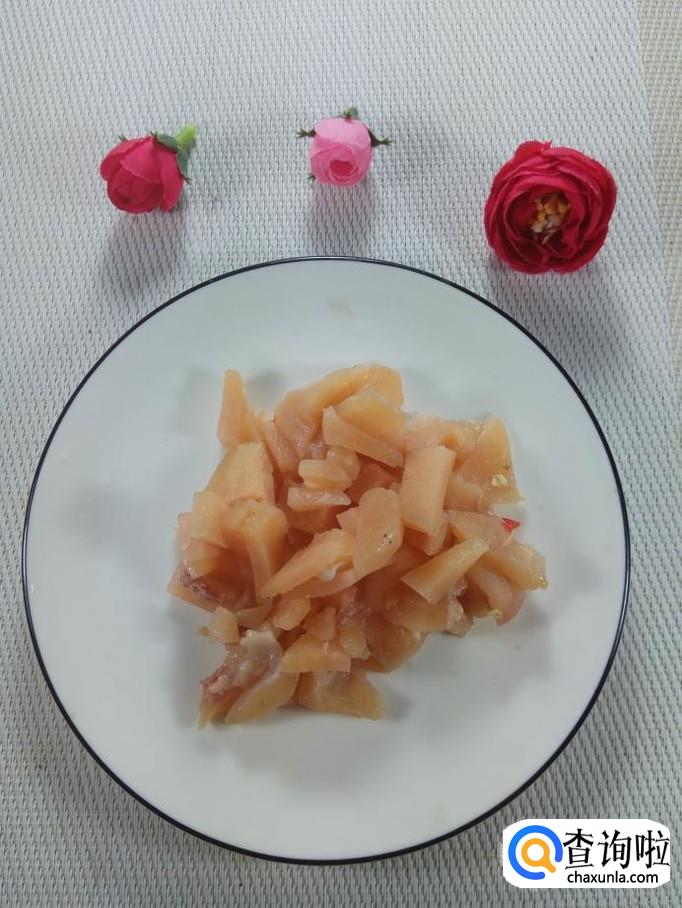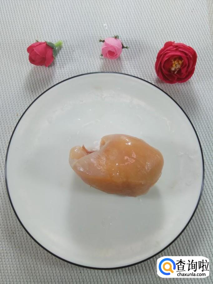 准备适量鸡胸肉,切成小块儿,再将葱,姜,蒜洗净后切碎,放在上面,加入适量盐,鸡精,五香粉,生抽,料酒,搅拌均匀,腌制十分钟。