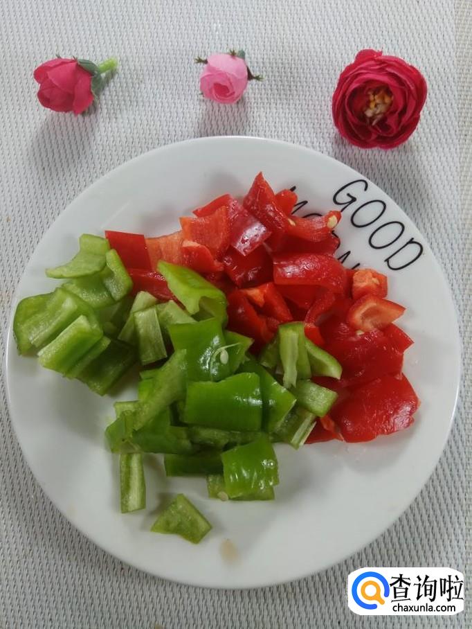 将香菇切丁,然后再将青红椒切成小块,放入盘中备用。