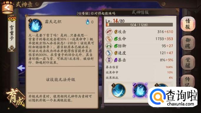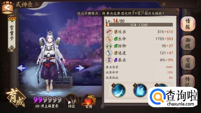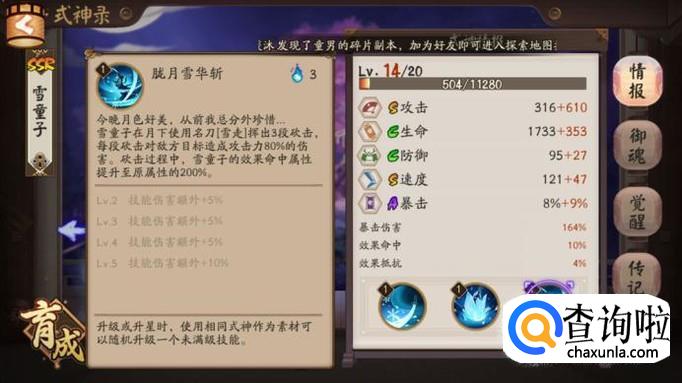 在觉醒副本中雪童子的表现稍微差一点,因为boss是魔免的因此雪童子没有办法打出最高伤害,但是却可以作为单体控制式神来使用,而且就算不攻击冰冻单位雪童子的输出也不低,可以造成240%的伤害。