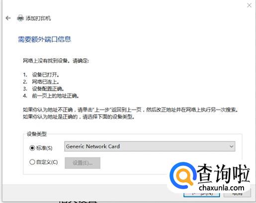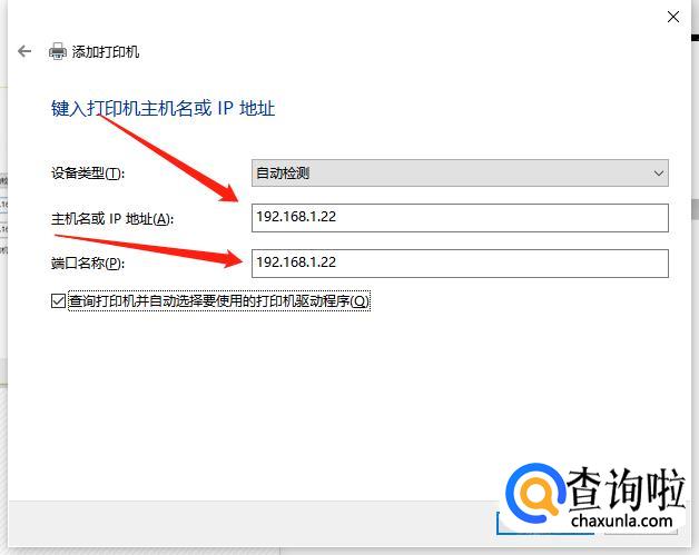 把打印机主机名或IP地址输入,点击“下一步”。