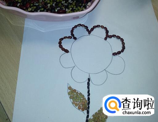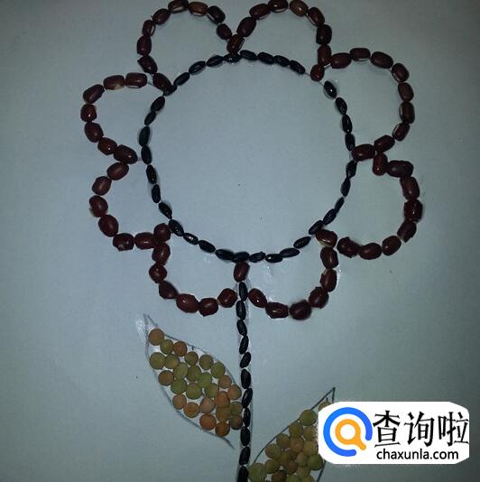 用红豆、绿豆粘在花瓣和叶子上。