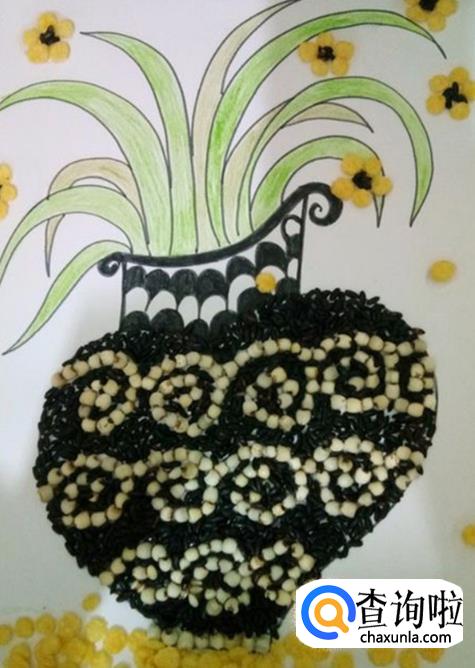 最后一步,在你想开花的地方,先用胶水在纸上糊一个硬币大小的小圈, 接着,取出盘中的黄色玉米片。在涂有胶水的地方,用五个玉米片摆出一朵画来。最后在花心上撒上少许的黑米。根据画面需要,可以多开几朵小黄花,还可以自己想象-下,有些花瓣,在时间的记忆里,有的刚刚凋零,有的已经铺满了一地。好了,这样文艺小清新花瓶粘贴画就完成了。