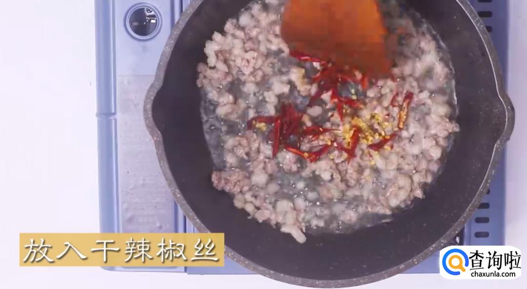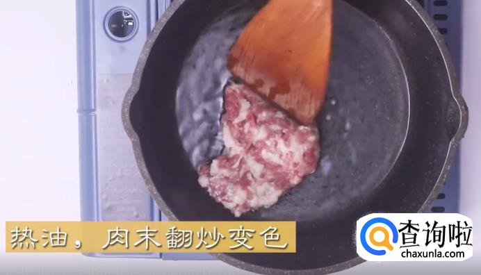 锅中热油,放入肉末翻炒至变色。
