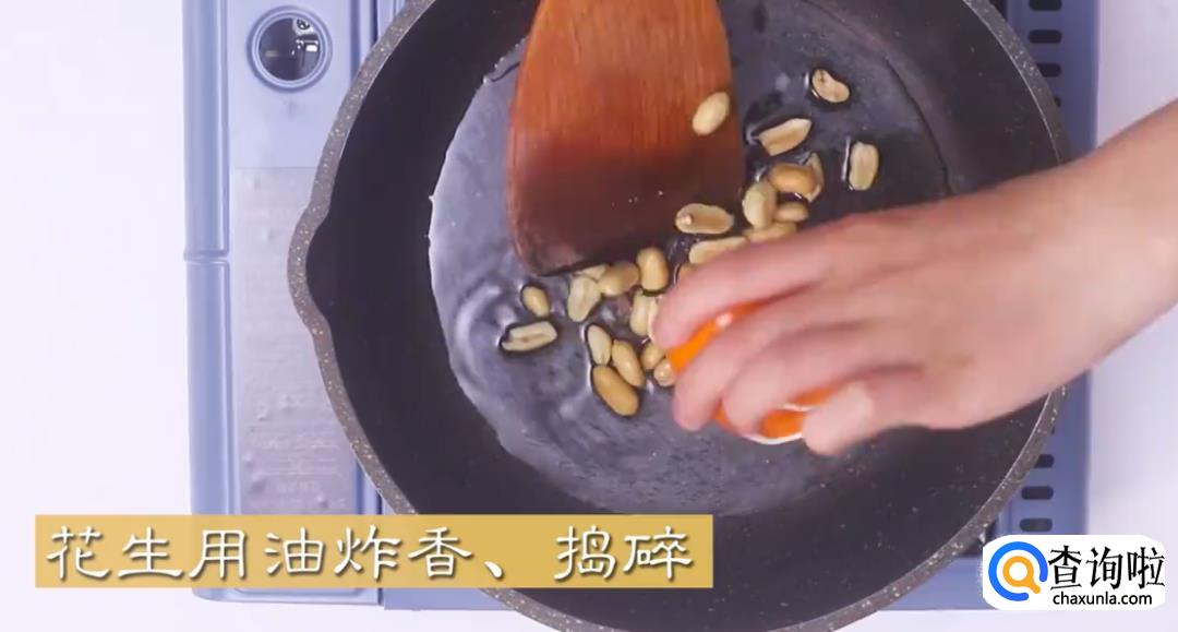 将花生米用油炸香后捣碎。
