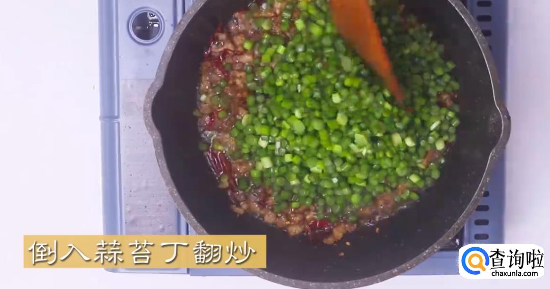 倒入蒜苔丁翻炒。