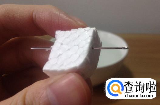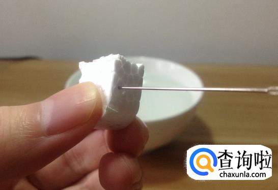接着就把针平缓的插进泡沫里面,尽量往上面插一点,因为这样的话会不容易沾上水,如下图所示。