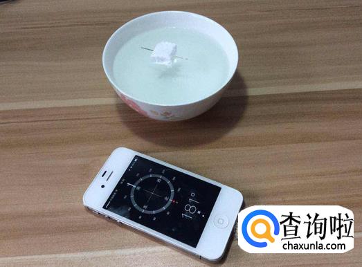 把指南针放进水里后会发现它会自动转圈,然后就会保持一个方向不再动,切记不要让泡沫挨着碗边缘,因为这样的话会影响方向的准确性,如下图所示。