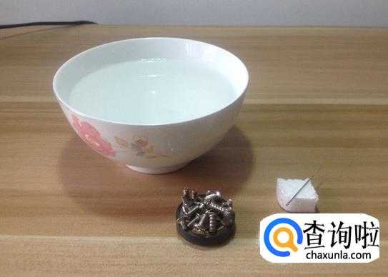 先准备一块磁铁,一根针,一块泡沫和一碗水,如下图所示。