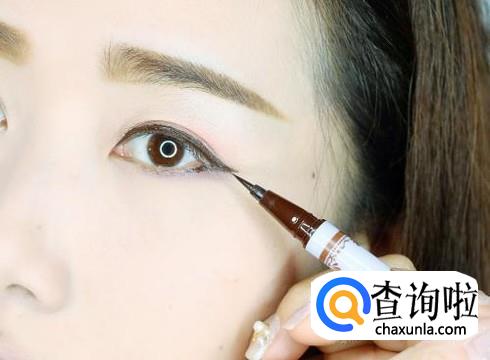 用眼线液在眼尾适当拉伸一下,可以起到放大双眼的效果。(注意不要拉长太多,会显得很夸张。)