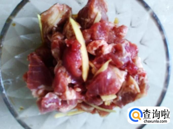 首先把猪肉清洗干净切成薄片,加适量的盐、姜丝、半小勺生抽、1勺料酒腌制几分钟。