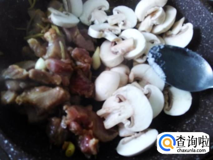 炒至肉片变色,然后铲到锅边,再下适量的油到锅空格,放蘑菇进去加适量的盐。