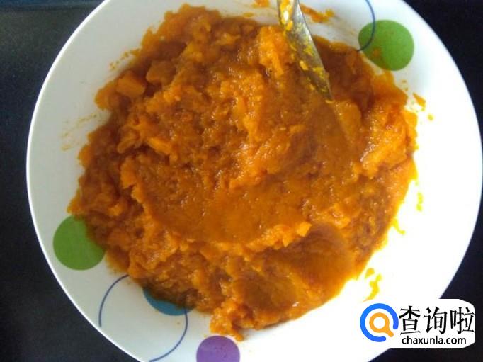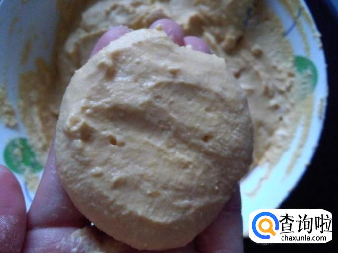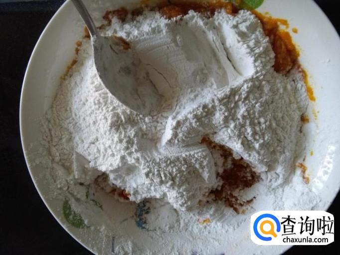 南瓜泥温热时,将糯米粉倒入南瓜泥中,和成面团,要充分拌匀,不要有疙瘩,面团不要太干