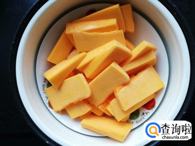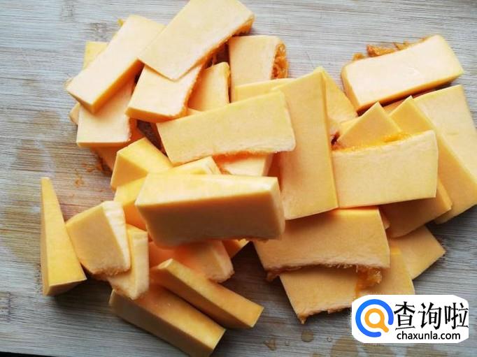 将南瓜洗干净,去掉瓜皮和瓜瓤,切成块