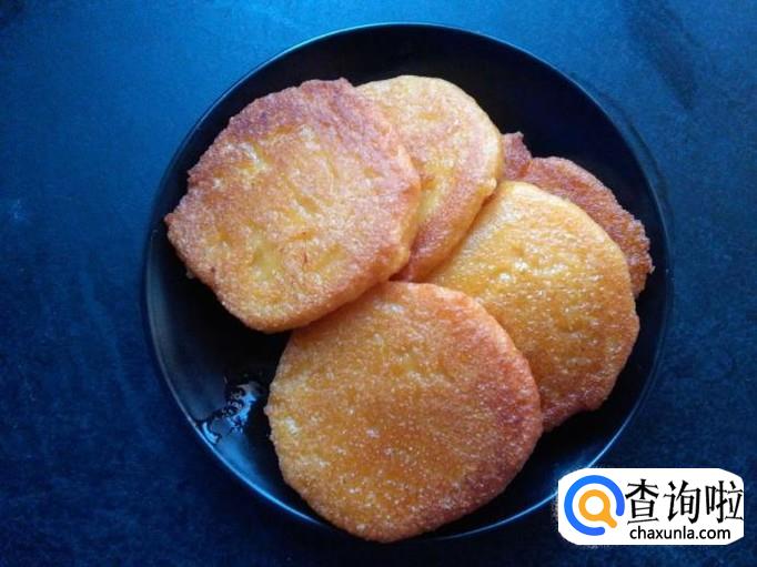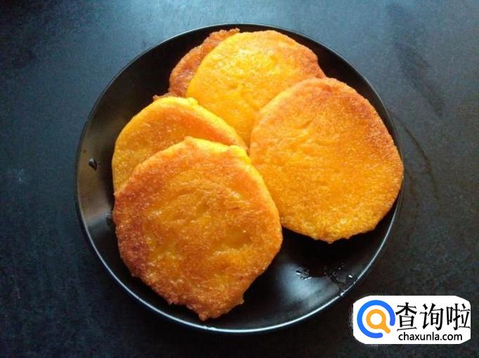 将南瓜饼一面煎至金黄后,翻过来煎另一面,直至两面金黄