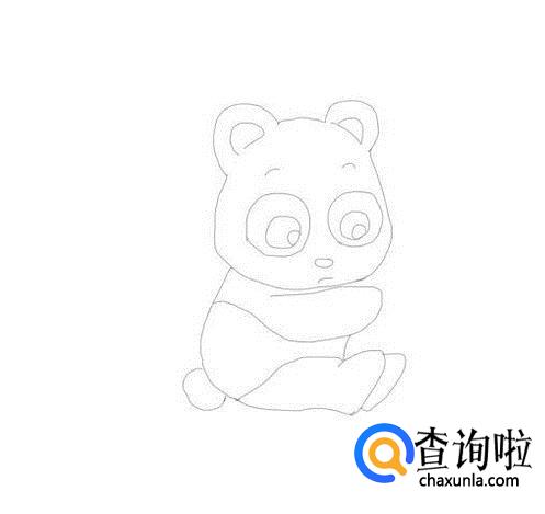 在熊猫的头部下面画出熊猫的身体,然后在画出熊猫的上肢,如图所示: