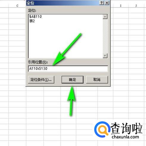 接着,在引用位置这里输入要选定的单元格区域,比如,A110:G130;同样可以快速的选中A110:G130这区域的单元格。