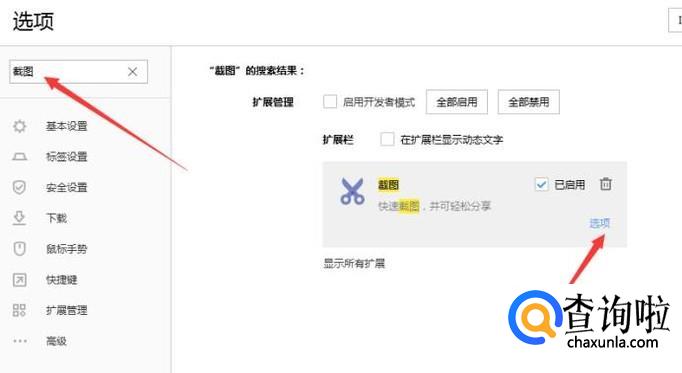 在左上角的搜索栏输入截图就可以看到截图设置了,点击选项,如下图。