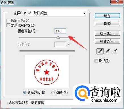 点色彩范围选项在弹出的对话框内使用吸管吸取背景的颜色,然后设置颜色容差值,如图所示: