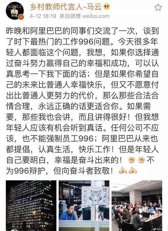 4月11日,马云在阿里巴巴内部交流活动上谈到了对“996”的看法。