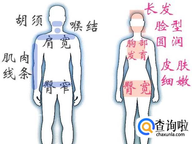 男生喉结突出,胡须和眉毛浓密,眉弓突出,脸型棱角分明,声音从儿时的细高稚嫩变得低沉粗犷,肌肉结实,骨架粗大,肩宽臀部窄;