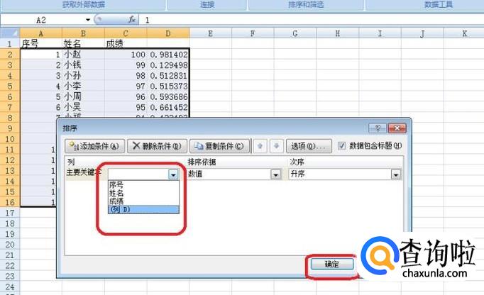 出现“排序”选项框,我们在主要关键字选择“列D”,次序选择“升序”或者“降序”都没关系,点击“确定”。可以发现,每行数据都被随机打乱了。