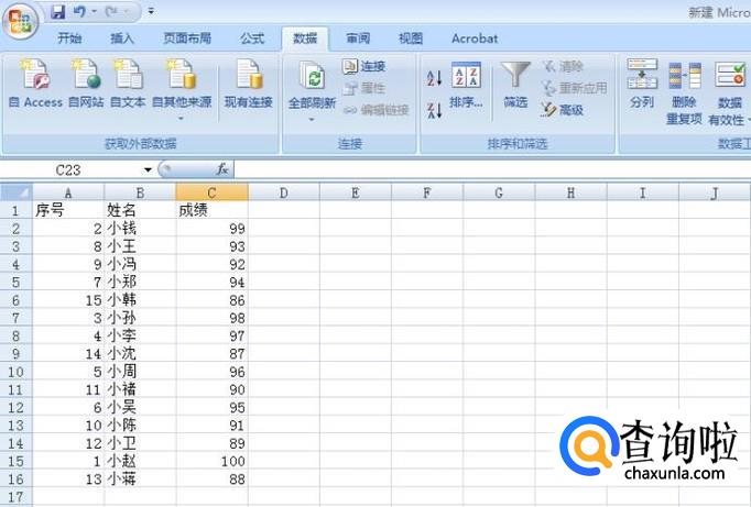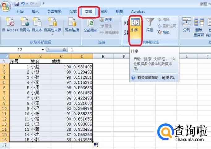 如图所示,选中全部需要排列的数据,点击标题栏“数据”标签,点击“排序”。