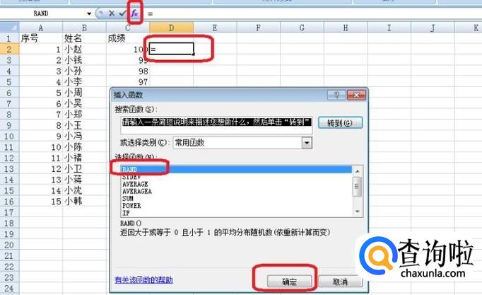 在表格中如图位置输入“=”,点击函数“fx”按钮,选择随机函数“RAND”,点击“确定”,该处位置被赋予一个0~1之间的随机值。