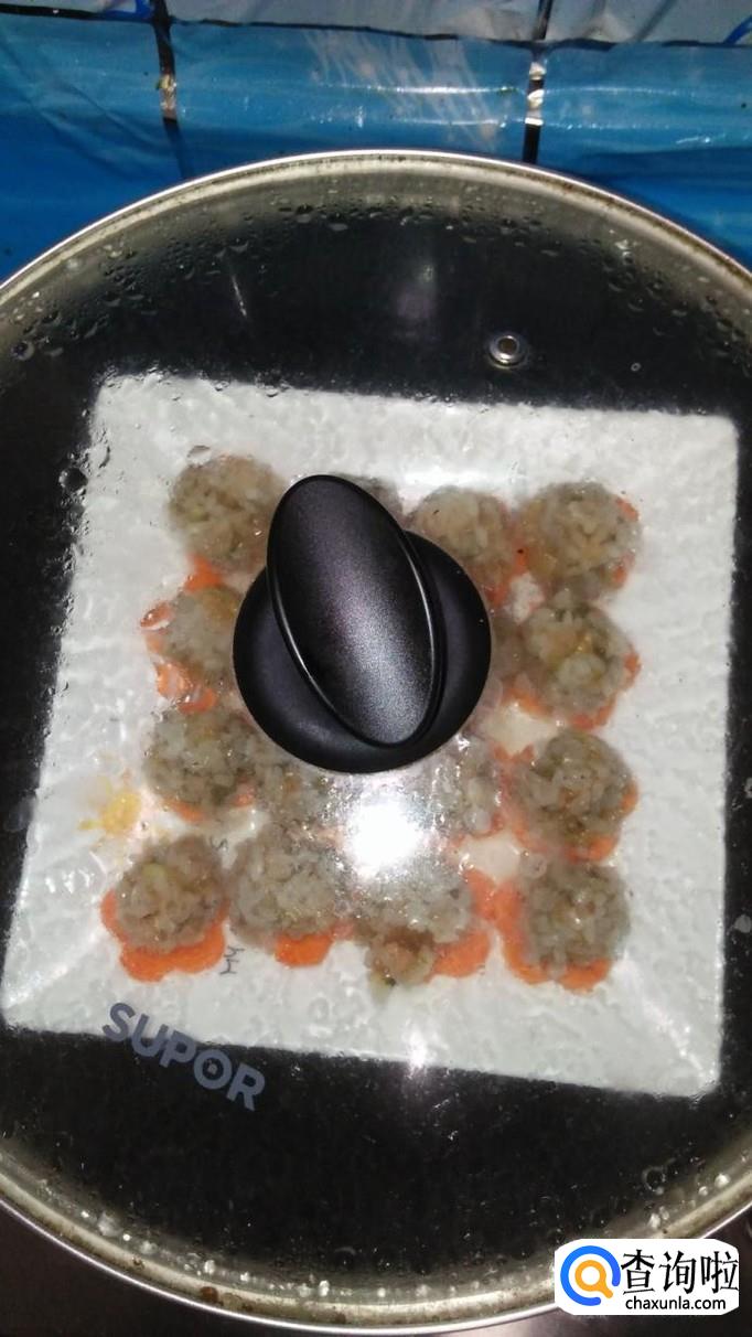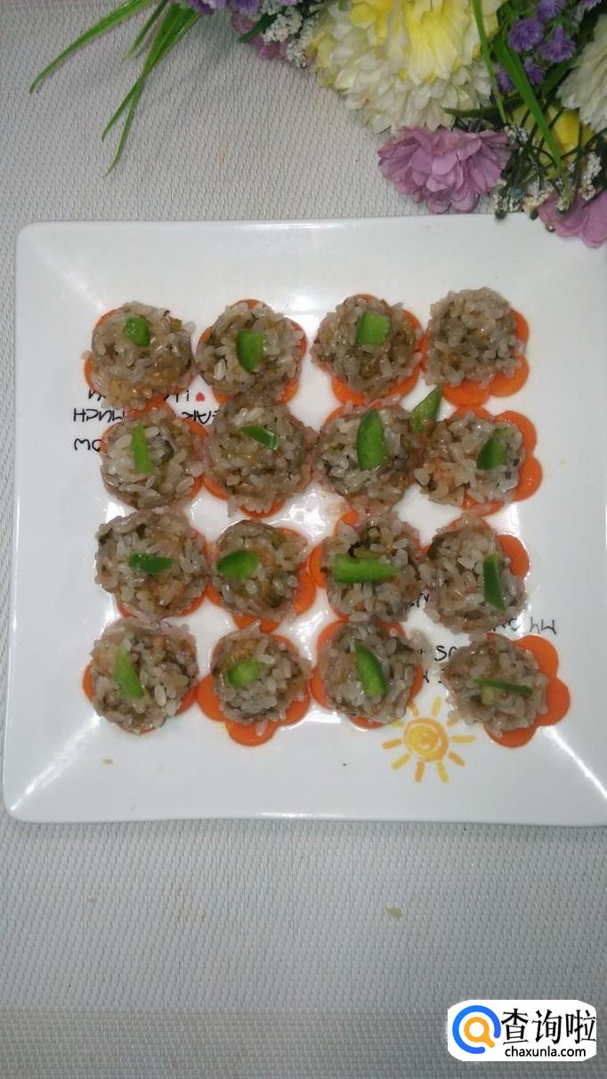 冷水上锅,盖上锅盖儿,蒸20分钟,就熟了,然后在丸子上面摆上青椒粒,珍珠丸子更加漂亮了。
