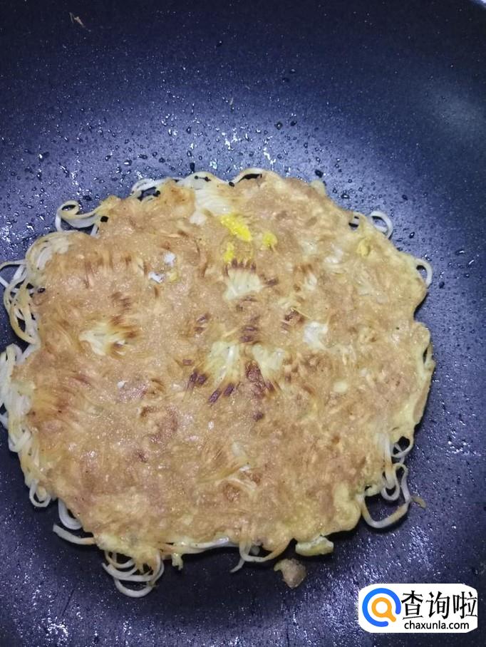 平底锅放入适量油,油热后放入煮好的挂面,将挂面摊成圆饼状。