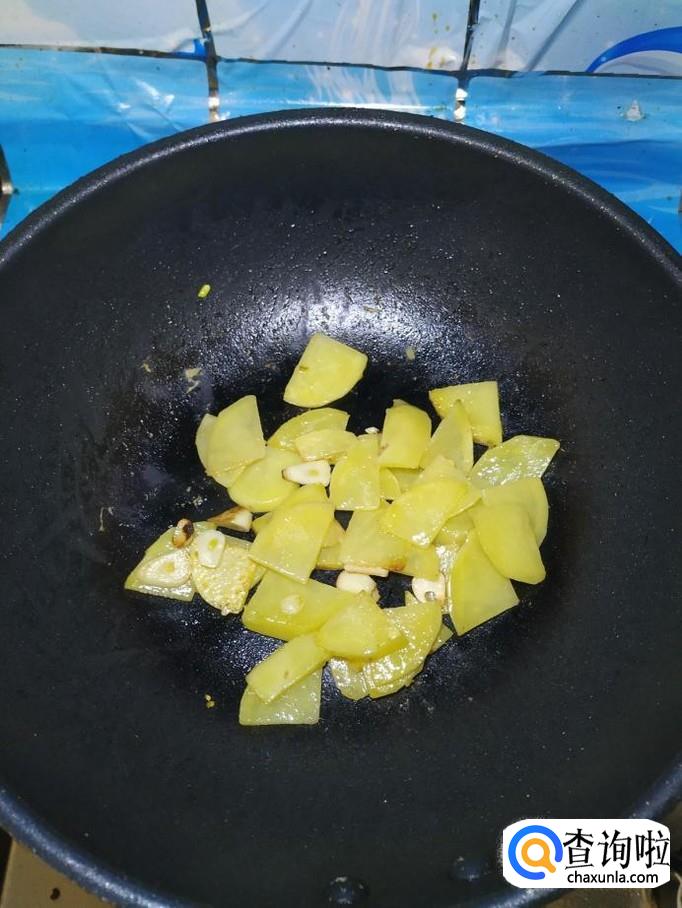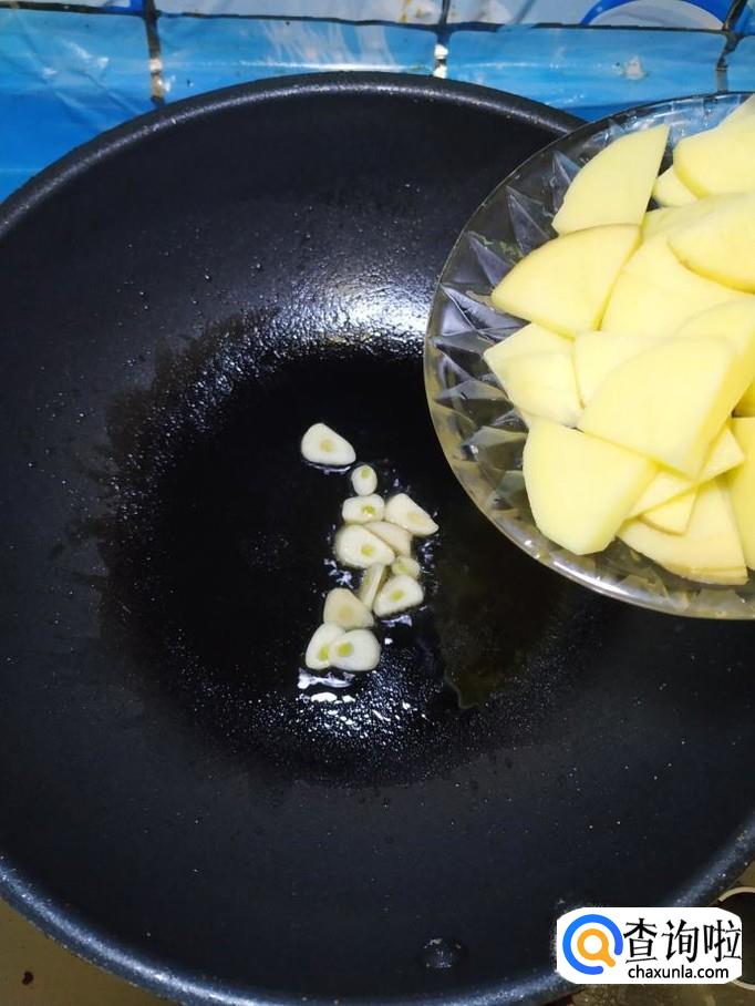 准备适量蒜,洗净后切成片,炒锅中放入适量油,油热后将蒜片放入锅中炒香,然后将准备好的土豆片,放入锅中,翻炒均匀。